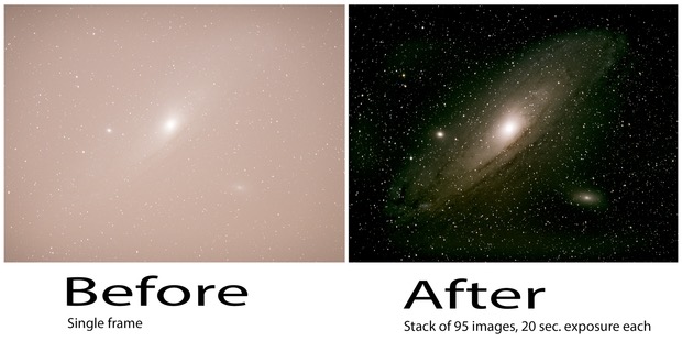 Bij Deep Sky fotografie wordt over het algemeen gewerkt met lange belichtingstijden, tot enkele minuten per opname. De beeldverwerking daarvan bestaat kort samengevat uit kalibratie (ruis en artefacten verwijderen uit de opname), registratie (afzonderlijke opnamen uitlijnen zodat ze samengevoegd kunnen worden) en integratie (het stapelen of stacken van de gekalibreerde, uitgelijnde beelden). Daarna wordt de ruwe stack nabewerkt tot het uiteindelijke beeld. Hieronder de Andromedanevel met links een enkele opname, en rechts het resultaat na bewerking van 95 opnamen.