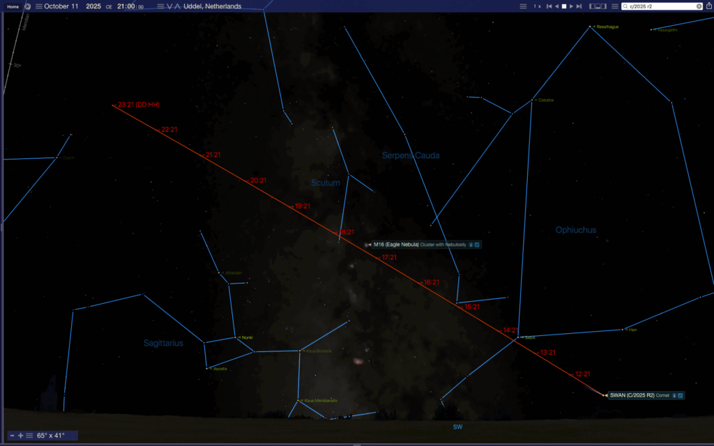 Naar verwachting zal de komeet C/2025 R2 (SWAN) in oktober op het noordelijk halfrond zichtbaar zijn boven de zuidwestelijke horizon. Zoekkaartje hieronder is van 11 tot en met 23 oktober, telkens omstreeks 21:00 uur.