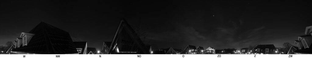 Onderstaande 360° panorama opname toont het zicht vanuit de sterrenwacht, met bijbehorende windrichting. Klik op afbeelding of download afbeelding voor een hoge resolutie, en zoom in om, tussen de bewolking door, meer details in de sterrenhemel te zien. Jupiter staat in het zuidoosten.